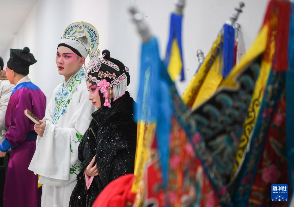 1月23日,汉剧演员郑桠文(右)在后台等待登台演出。