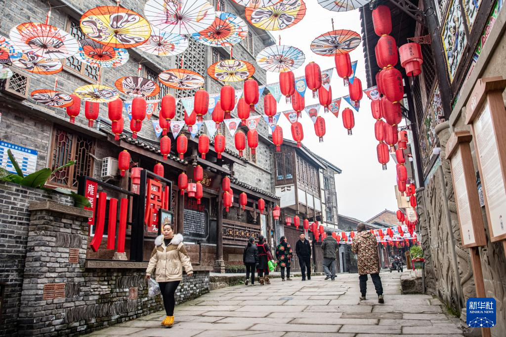 1月30日,居民在重庆市大足区雍溪古镇老街上感受春节氛围。