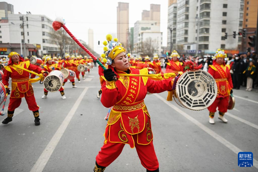 2月20日,在榆中县城关镇,兴隆山村社火队在表演太平鼓。