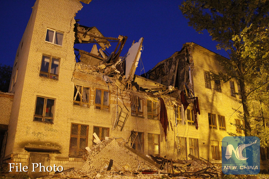 A damaged building is seen after an explosion in Donetsk, Ukraine, on June 29, 2017. (Xinhua/Alexander Ermochenko)