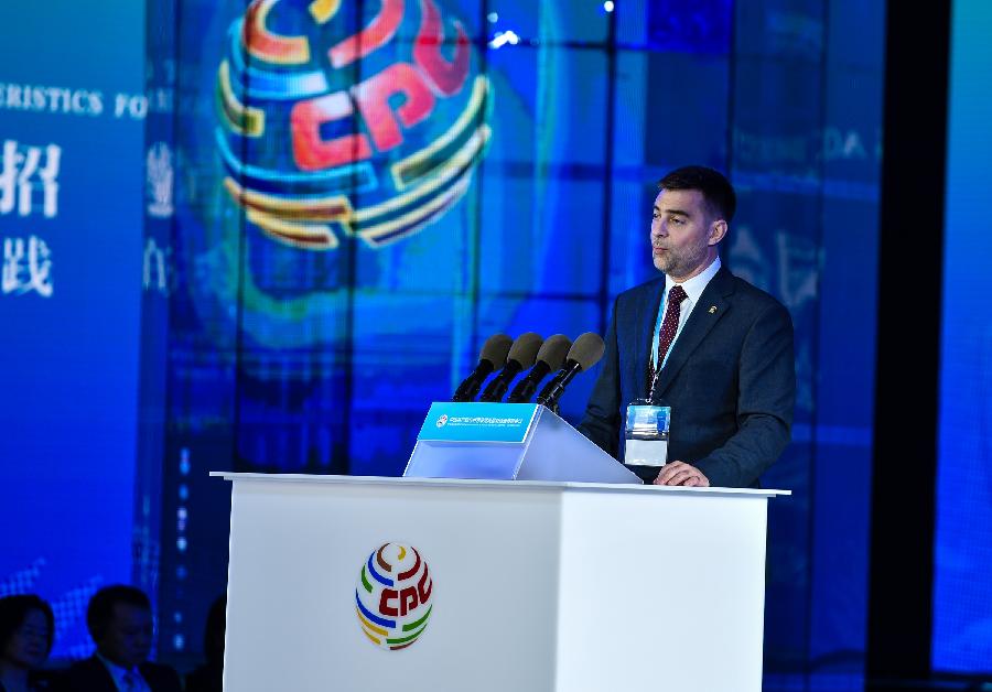 Sergey Zheleznyak,deputy secretary of the General Council of the United Russia Party, addresses a meeting with the theme "Reform and opening-up holds the key to the destiny of contemporary China" held in Shenzhen, south China's Guangdong Province, May 27, 2018. China's reform and opening-up has not only yielded top results, but also provided valuable experience to the world, according to attendees of a meeting held in Shenzhen. (Xinhua/Mao Siqian)