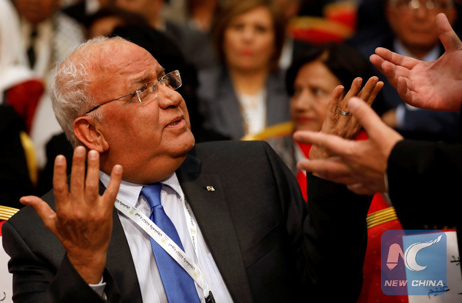 (File photo)Chief Palestinian negotiator Saeb Erekat gestures during the Palestinian National Council meeting in Ramallah, in the occupied West Bank April 30, 2018. (Reuters photo)