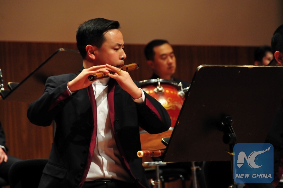 Musician of Gansu Dance Troupe are performing during Chinese New Year's show at the Great Guild Hall in Riga on Saturday night, on Jan. 26, 2019. The orchestra of the Gansu Dance Troupe introduced to the Latvian audience Chinese musical traditions by performing Chinese melodies, including Flying Apsaras and the Silk Road, a masterpiece reflecting the profound influences of Chinese dance traditions as well as the history of the region. (Xinhua/Janis Laizans)