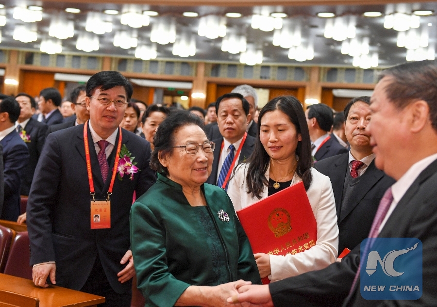 File Photo: Tu Youyou (front L), a pharmacologist of the China Academy of Chinese Medical Sciences, receives congratulations during an annual ceremony to honor distinguished scientists and research achievements in Beijing, capital of China, Jan. 9, 2017. (Xinhua/Li Xueren)