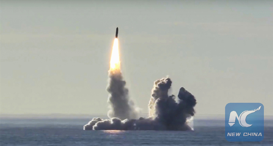 In this photo made from the footage released by the Russian Defense Ministry, Russian nuclear submarine Yuri Dolgoruky test-fires the Bulava missiles from the White Sea on May 22, 2018.