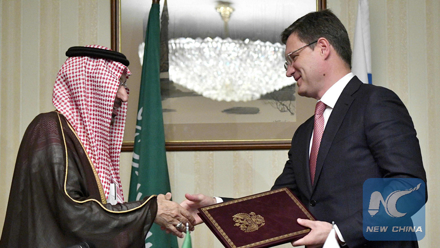 MOSCOW, June 10 (Xinhua) -- Saudi Arabia and Russia work on a bilateral basis as well as with other producing countries to prevent oil prices from plunging, visiting Saudi Arabian Minister of Energy, Industry and Mineral Resources Khalid Al-Falih said here Monday.