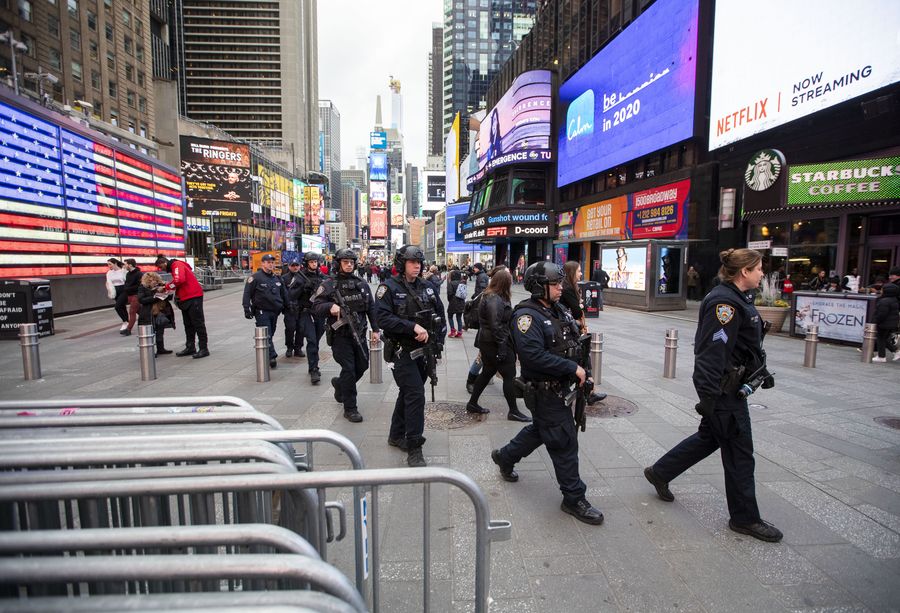 Police stand guard at Times Square in New York, the United States, Jan. 6, 2020. New York City (NYC) has stepped up security at key locations following the targeted killing of Iranian commander Qasem Soleimani by a U.S. airstrike in Iraq. (Xinhua/Wang Ying)