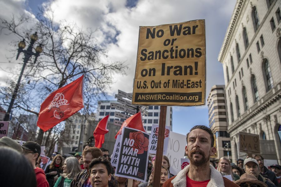SAN FRANCISCO -- Holding placards reading "No War on Iran" and "U.S. Troops out of Iraq," about 2,000 protesters rallied near a metro station downtown here Saturday to oppose the U.S. killing of a top Iranian military leader in Iraq.