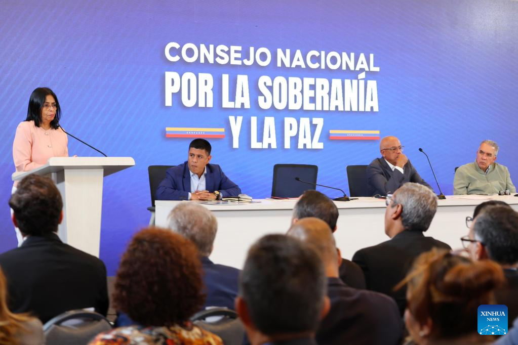 Venezuelan Vice President Delcy Rodriguez (1st L) speaks at a meeting of the National Council for Sovereignty and Peace in Caracas, Venezuela, on Sept. 29, 2025. Venezuelan President Nicolas Maduro signed a decree on "State of External Commotion" in response to what the government described as foreign aggressions, Vice President Delcy Rodriguez said here Monday. (The National Assembly of Venezuela/Handout via Xinhua)