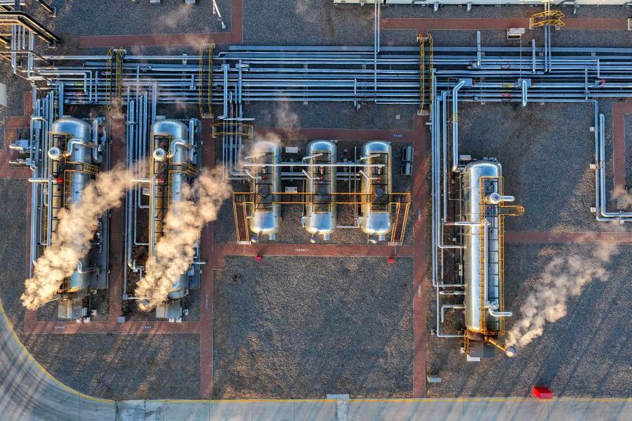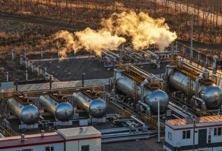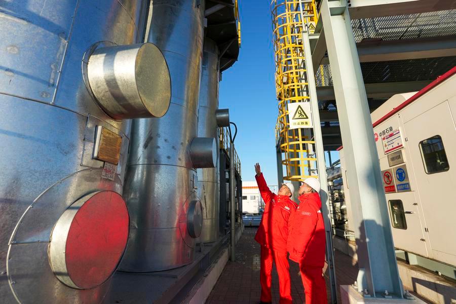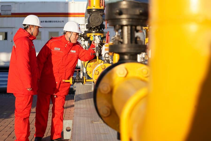 Operators carry out inspection work on oil and gas processing equipment at a national-level demonstration zone of continental shale oil of Daqing Oilfield in Daqing, northeast China's Heilongjiang Province, Dec. 4, 2025.  (Xinhua/Wang Song)