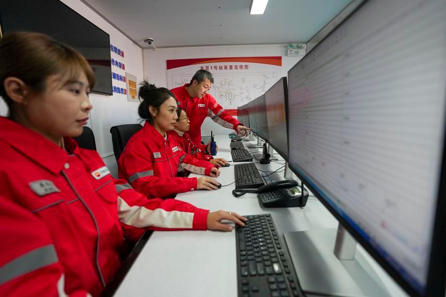Technicians check the operating parameters of the oil and gas processing equipment at a national-level demonstration zone of continental shale oil of Daqing Oilfield in Daqing, northeast China's Heilongjiang Province, Dec. 4, 2025. (Xinhua/Wang Song)