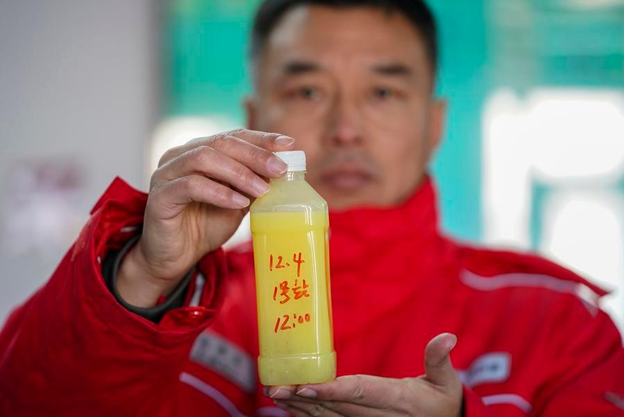 A staff member presents a shale oil sample at a national-level demonstration zone of continental shale oil of Daqing Oilfield in Daqing, northeast China's Heilongjiang Province, Dec. 4, 2025.  (Xinhua/Wang Song)