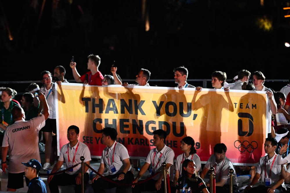 成都世运会推广歌曲《逐梦》响起,国际世界运动会协会会旗缓缓降下,标志着“成都时间”即将画上句点。成都市市长王凤朝将会旗郑重交予佩鲁雷纳,继而传递给下一届举办城市德国卡尔斯鲁厄市市长弗兰克·门特鲁普。