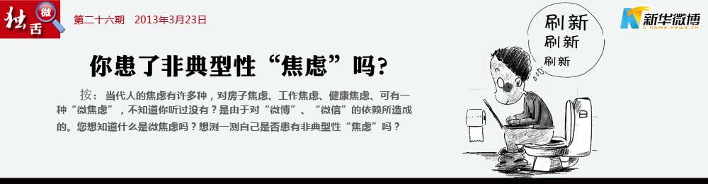 親,你出現(xiàn)“微焦慮”癥狀了嗎? 不“織圍脖”、不接發(fā)微信就寢食難安,出現(xiàn)焦慮、依賴、強(qiáng)迫等心理問題。這就是患上了微博焦慮癥,簡稱為“微焦慮”。