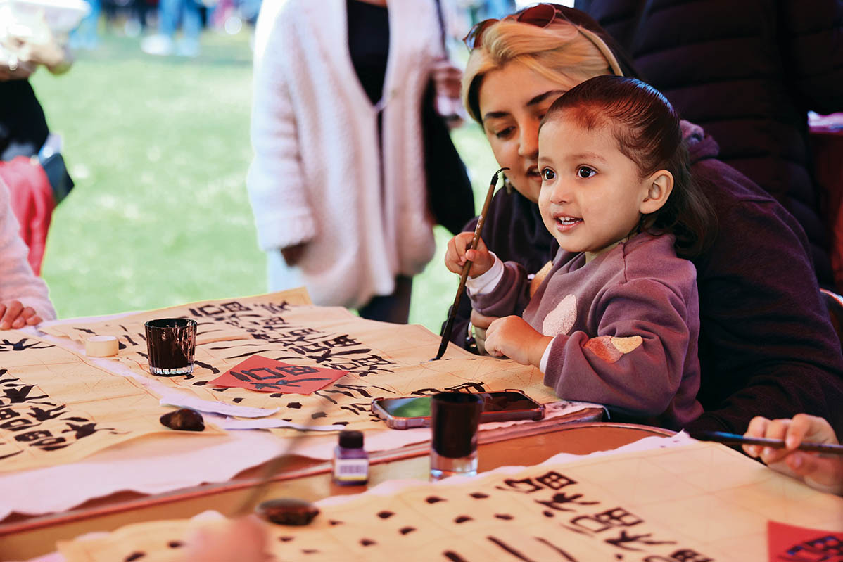 1月 25 日,在墨西哥首 都墨西哥城,一名儿童在第四届中国新年文化节上体验中国书法