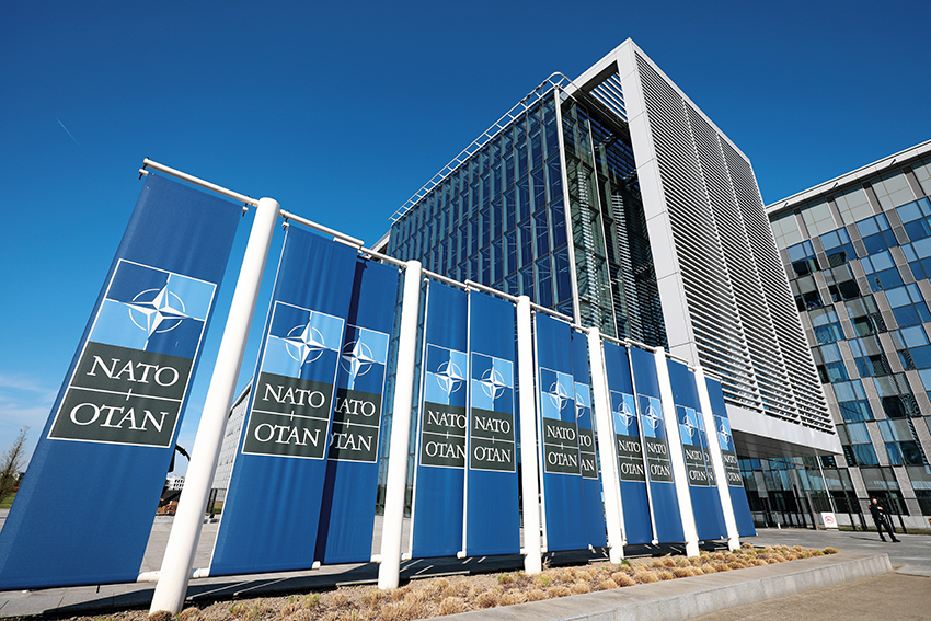 这是4月4日在比利时布鲁塞尔拍摄的北约总部一角