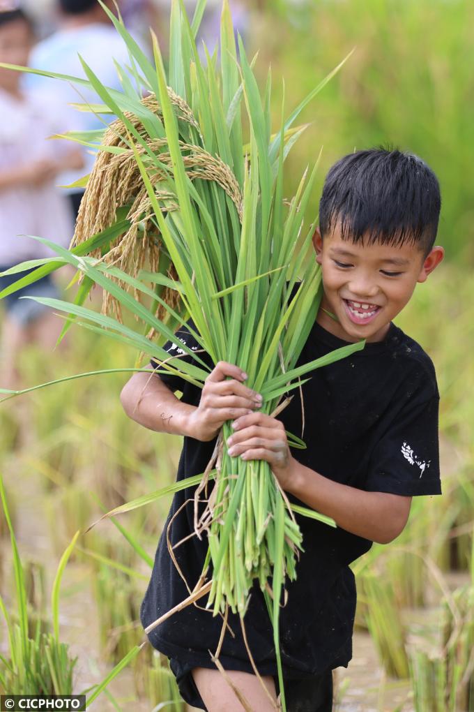 ↑2025年9月11日,贵州省遵义市正安县安场镇石井小学学生在劳动实践基地的稻田里搬运刚收割的水稻。CICPHOTO/赵永章 摄