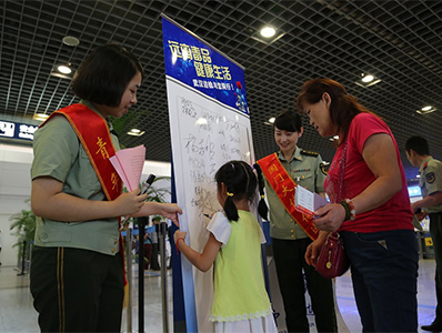 官兵發(fā)動(dòng)旅客現(xiàn)場簽名承諾“遠(yuǎn)離毒品”