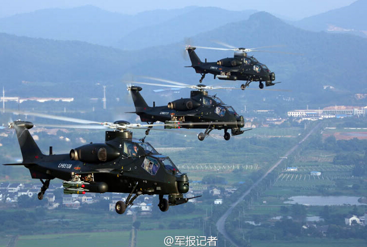 ????An army aviation brigade under the Nanjing Military Area Command (MAC) of the Chinese People's Liberation (PLA) conducted helicopter formation flight training for the defense penetration ability on July 15, 2015. (Source: people.com.cn)