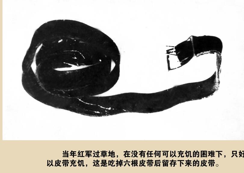 原來,這條皮帶是周廣才在1934年的一次戰(zhàn)斗中繳獲敵人的戰(zhàn)利品。但為了使全班戰(zhàn)友活下來,他只得含淚將皮帶拿出來。皮帶被切成幾段丟入滾燙的熱水中,煮熟后每人夾起“一截”狼吞虎咽的吃起來……當(dāng)鍋里還剩最后“一截”時(shí)他哭著說:“同志們,咱們留著它作個(gè)紀(jì)念吧,帶到延安去見毛主席?!睉阎鴮?duì)革命勝利的無限渴望,最終他們把這截皮帶留了下來。