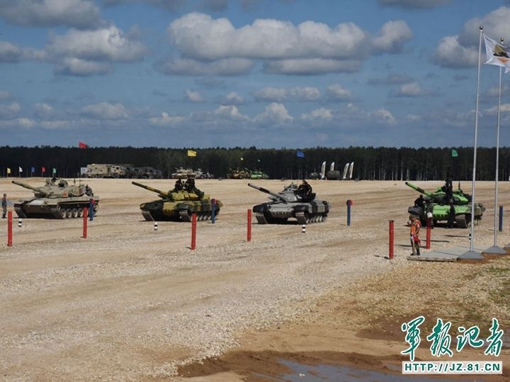 “坦克兩項(xiàng)”半決賽接力賽中國(guó)、吉爾吉斯斯坦、亞美尼亞、安哥拉的4輛坦克準(zhǔn)備出發(fā)。武元晉 攝