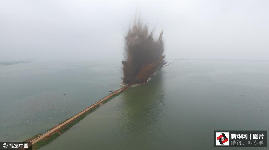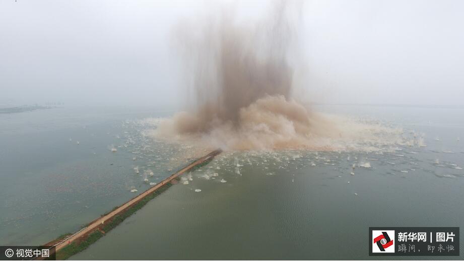 ??? 7月14日7時,伴隨著一聲聲的爆破轟鳴,梁子湖與牛山湖隔堤正式實施爆破作業,這標志著湖北梁子湖流域的牛山湖正式破垸分洪。(圖片來源:視覺中國)