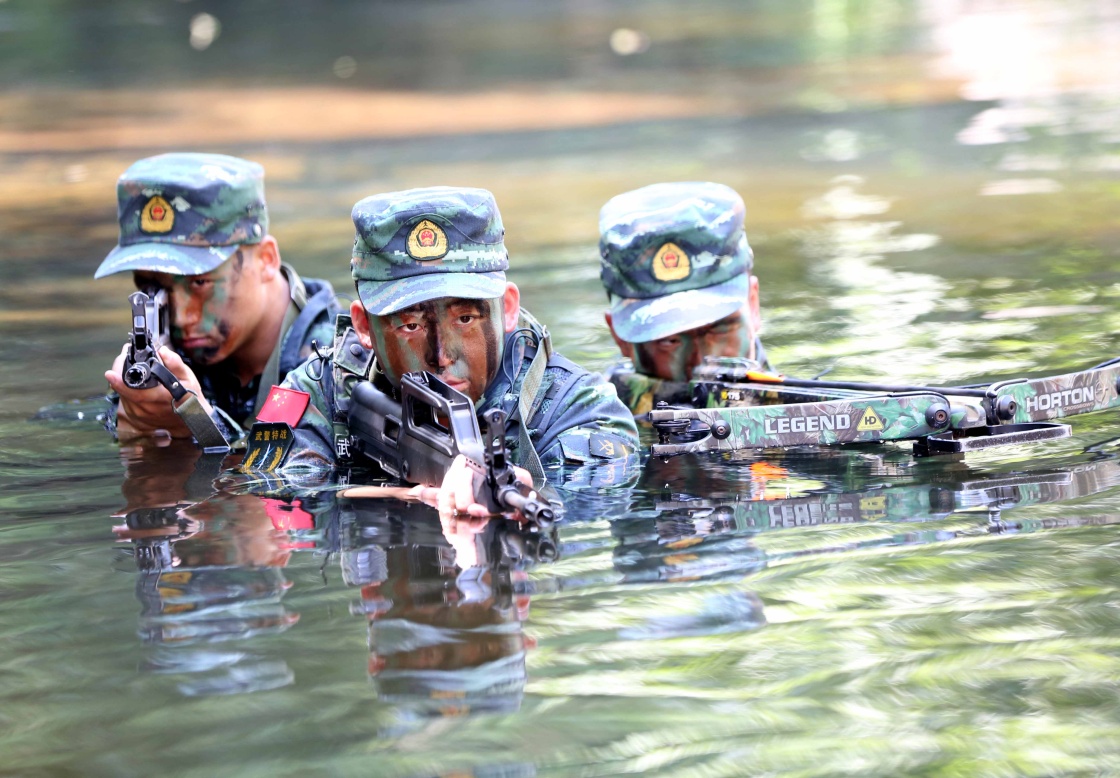 ????當日,武警山東總隊煙臺支隊組織特戰狙擊手冒著34攝氏度的高溫來到昆崳山開展叢林訓練。狙擊手們身穿偽裝服圍繞野外生存、偽裝潛伏、極限體能等6項17個課目進行綜合訓練,在實戰背景下磨礪狙擊手野外生存技能和戰術素養,鍛造反恐處突利刃。新華社記者 朱崢 攝
