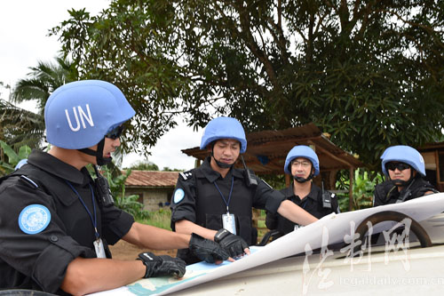 圖為防暴隊黨總支書記徐曉偉(左三)帶隊執(zhí)行利比里亞博米州武裝巡邏任務