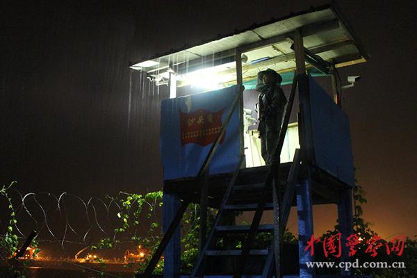 ????崗亭上,燈光下,筆直的身影密切注視著營區四周,曾經有小偷趁雨夜藏匿海邊的雜草叢中,隊員及時發現并驅離,在雨夜里隊員們格外警惕,確保營區安全。(邵梁攝)