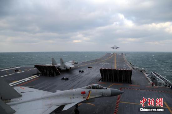 資料圖:2016年12月23日,在黃海某海空域,多批次殲-15艦載戰(zhàn)斗機(jī)從遼寧艦飛行甲板起飛升空,開(kāi)展了空中加受油、空中對(duì)抗等多項(xiàng)訓(xùn)練任務(wù)。 中新社發(fā) 莫小亮 攝