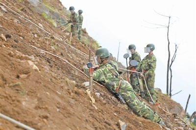 “報告,發現兩枚地雷!”只見中士高彬濱輕輕放下探雷器,慢慢趴下身子,拿出隨身攜帶的工兵鏟,小心鏟去地雷表層的植被和土壤,一點點擴大雷坑……此時,高彬濱距記者只有幾米,腳下是陡峭的崖壁,眼前是隨時可能爆炸的地雷,頭頂上方還可能隨時出現滾石,哪一處出現意外,后果都不堪設想。身臨其境,記者不禁替他捏了一把汗。