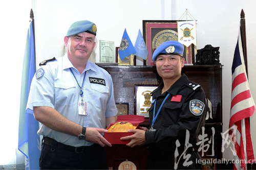 ????藍(lán)隊長向總警監(jiān)匯報了中國防暴隊編成、物資裝備、甄選考核以及抵達(dá)任務(wù)區(qū)后執(zhí)行維和勤務(wù)等情況,介紹了中國防暴隊在部隊正規(guī)化建設(shè)、治安形勢研判、后勤綜合保障等方面經(jīng)驗做法,并表示將恪守聯(lián)合國核心價值,堅決服從聯(lián)利團(tuán)指揮鏈條,嚴(yán)格落實防暴辦下達(dá)的各項指令任務(wù),繼續(xù)保持和發(fā)揚中國維和警隊紀(jì)律嚴(yán)明、敢打硬仗的優(yōu)良傳統(tǒng)。
