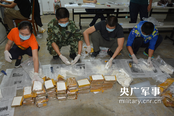 邊防官兵正在拆分毒品外包裝