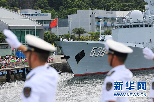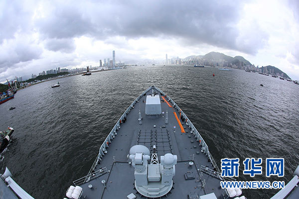 7月7日,海軍銀川艦駛入香港昂船洲碼頭。當日,正在執行跨區機動訓練任務的中國人民解放軍海軍航母編隊抵達香港,參加香港回歸祖國暨中國人民解放軍進駐香港20周年慶祝活動,受到香港特區政府和民眾熱烈歡迎。新華社記者 曾濤 攝