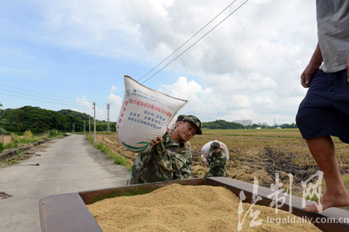 廣東中山邊防官兵走進田間地頭幫農戶搶收稻谷