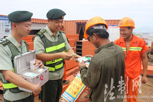 ????連日來,浙江溫州持續出現高溫天氣,為幫助轄區群眾做好防暑降溫工作,浙江溫州邊防支隊官兵在轄區巡邏時多帶了藥箱,備上人丹、清涼油、藿香正氣水等防暑藥品,特別是在高溫時段為農戶、工人送上,以防他們高溫勞作時中暑。(戚如潑 金睿濤)