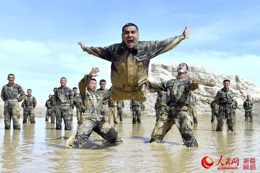 特戰隊員進行泥潭格斗訓練。