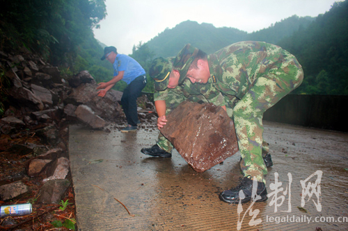 ????原標(biāo)題:進鎮(zhèn)盤山要道落石中斷 福建鑒江邊防官兵放棄軍人節(jié)日冒雨搶通