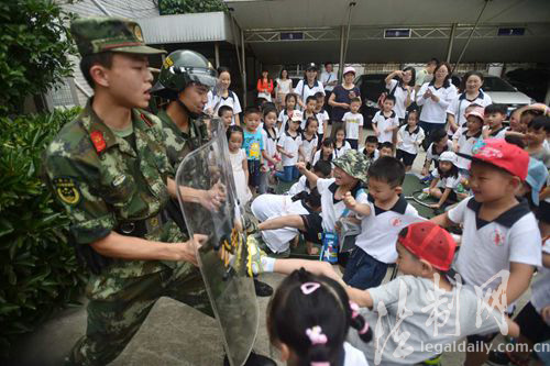 ????8月7日上午,江蘇邊防總隊揚州邊檢站營區內傳出一陣陣稚嫩的驚嘆聲和歡呼聲,36名東方劍橋外語幼兒園學生及家長一同走進邊防部隊營區,與武警叔叔共同感受部隊的真實生活。