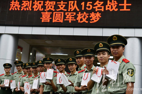 圖為金榜題名的戰士拿著支隊贈予的小禮物合影留念,臉上樂開了花