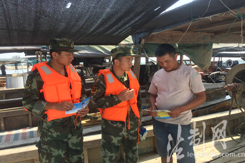 圖為邊防官兵深入海上船舶進行法律知識宣傳