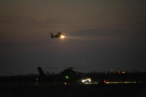 ????夜間,多架多型號武裝直升機帶彈起飛(4月18日攝)。