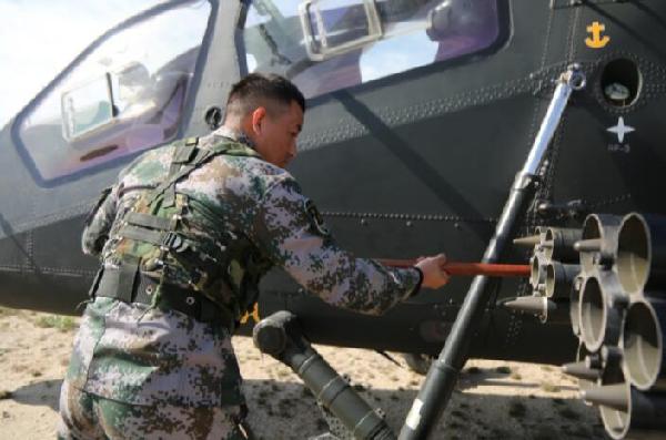 ????軍械員在為新型武裝直升機裝彈(4月18日攝)。