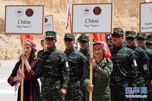 4月30日,在約旦阿卜杜拉國王特戰訓練中心,中國武警代表隊隊員(后)參加“勇士競賽”國際特種兵比武。新華社記者 林曉蔚 攝