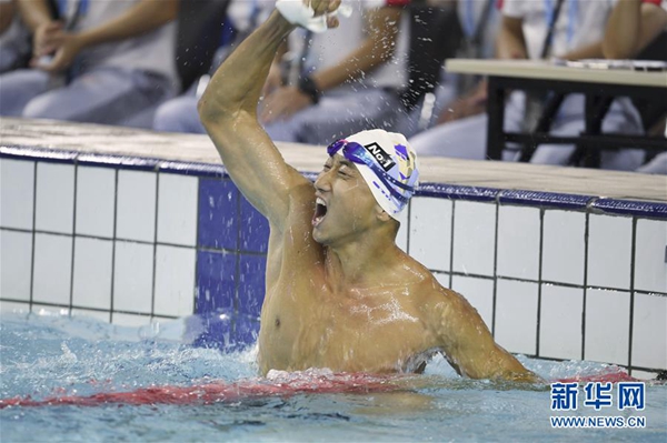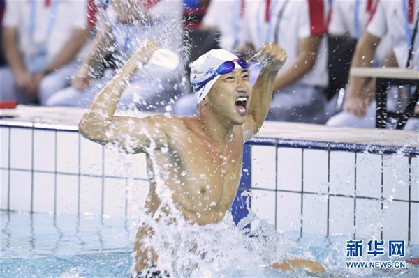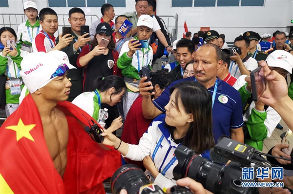 走出泳池,張政成了場上的“明星”,和幾個隊(duì)友擁抱擊掌后,便立刻被眾人圍在中間。現(xiàn)場觀眾和其他運(yùn)動員紛紛向他表示祝賀,人群中不時有人歡呼著“世界紀(jì)錄!世界紀(jì)錄!”。隨后,激動的張政披著國旗,在泳池邊跟家人、朋友合影,定格了這難忘的一刻。