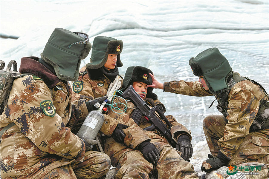 巡邏途中,一名戰(zhàn)士因高原反應(yīng)接受吸氧急救。