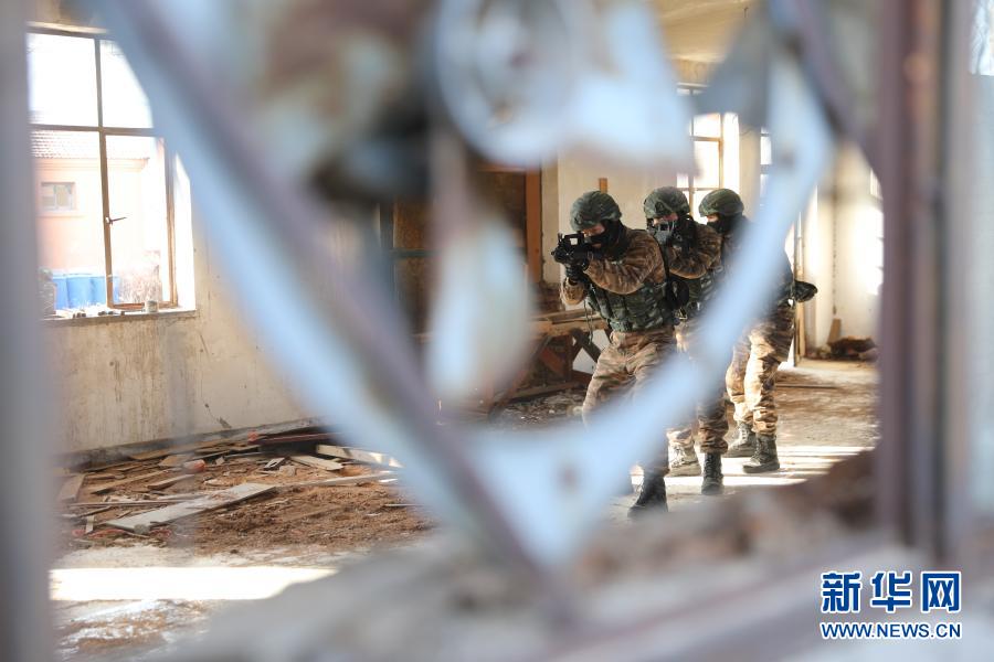 武警上??傟牂C動第一支隊特戰隊員在進行居民地搜剿訓練(12月11日攝)。新華社發(李巖 攝)