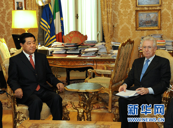 ????當地時間11月28日,全國政協主席賈慶林在羅馬會見意大利總理蒙蒂。(來源:新華社記者 李學仁 攝)