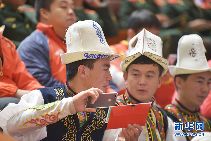 10月1日,慶祝中華人民共和國成立66周年暨新疆維吾爾自治區成立60周年大會在新疆人民會堂舉行。圖為參會的少數民族代表在會前交談。新華網記者 郭小天 攝