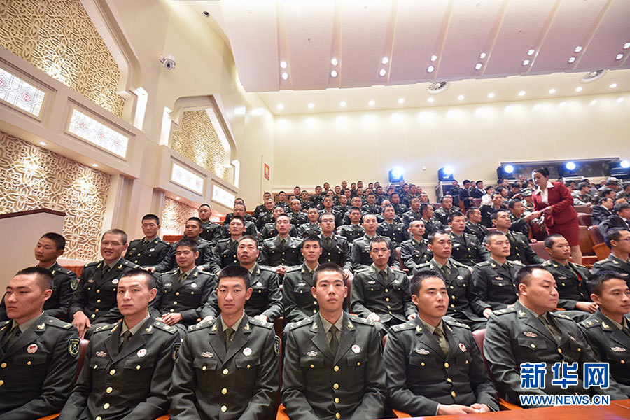 10月1日,慶祝中華人民共和國成立66周年暨新疆維吾爾自治區成立60周年大會在新疆人民會堂舉行。圖為參會的解放軍代表入座。新華網記者 郭小天 攝